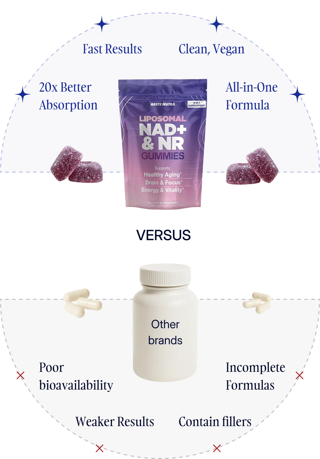 These powerful daily gummies are clinically formulated to increase NAD+ levels by up to 93%, helping fuel your cells for all-day energy, mental clarity, and visible anti-aging benefits.