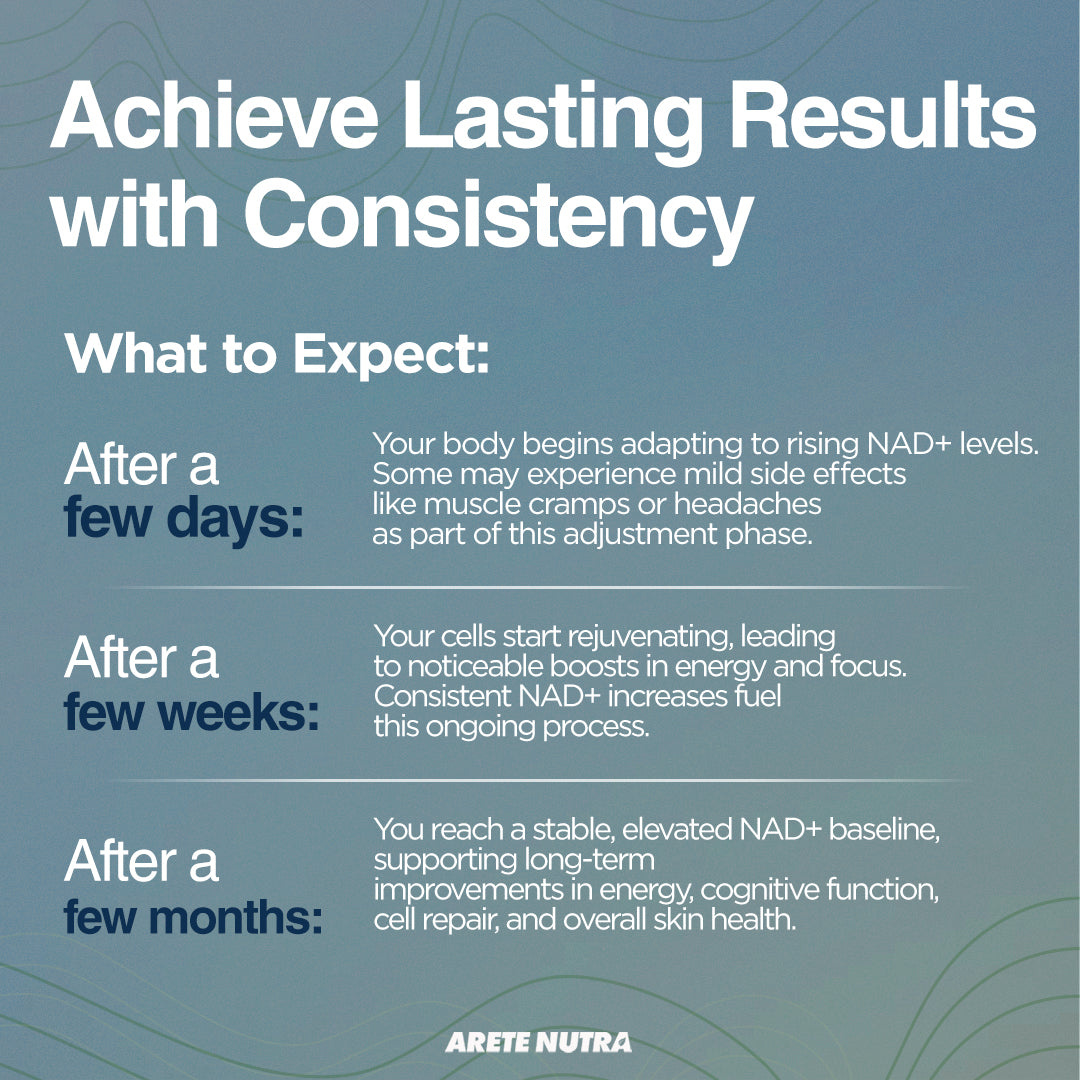 For optimal results, we suggest taking Arete NAD+ in the morning to fuel your day with sustained energy. The recommended daily dose is 2 capsules. You have the flexibility to take it with or without food, or even in one of your favorite drinks.